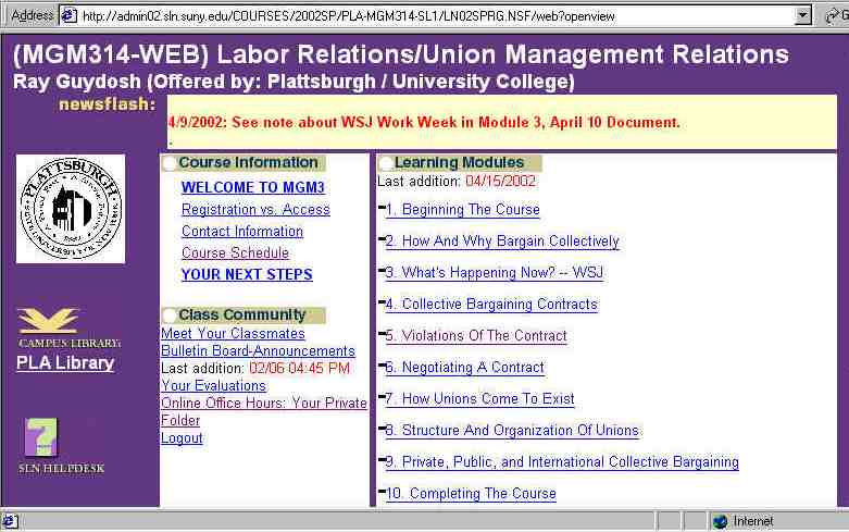 In order to access this course you must register with the SUNY Learning Network as well as with Plattsburgh State. Use your web browser to access http://sln.suny.edu for information on the course, to register, and to obtain a password to access the course.
